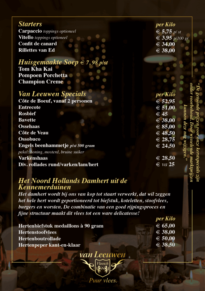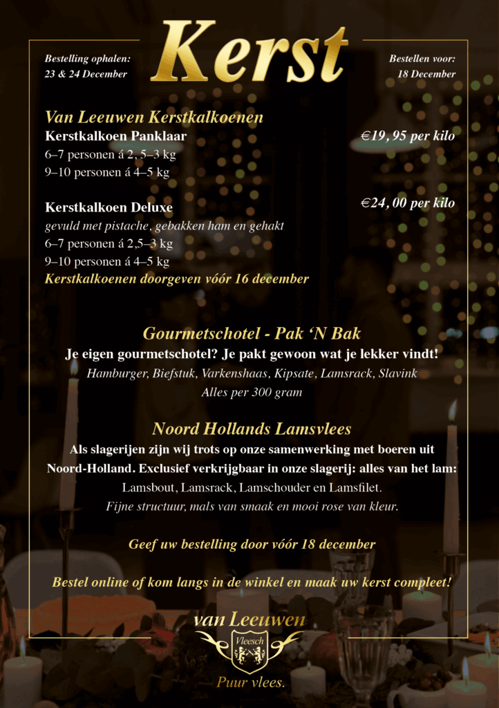 Bestel jouw heerlijke kerstmaaltijd eenvoudig online of kom gezellig langs in onze winkel! Van malse kalkoen en sappige rollades tot luxe gourmetschotels – wij zorgen voor het perfecte feestmaal.